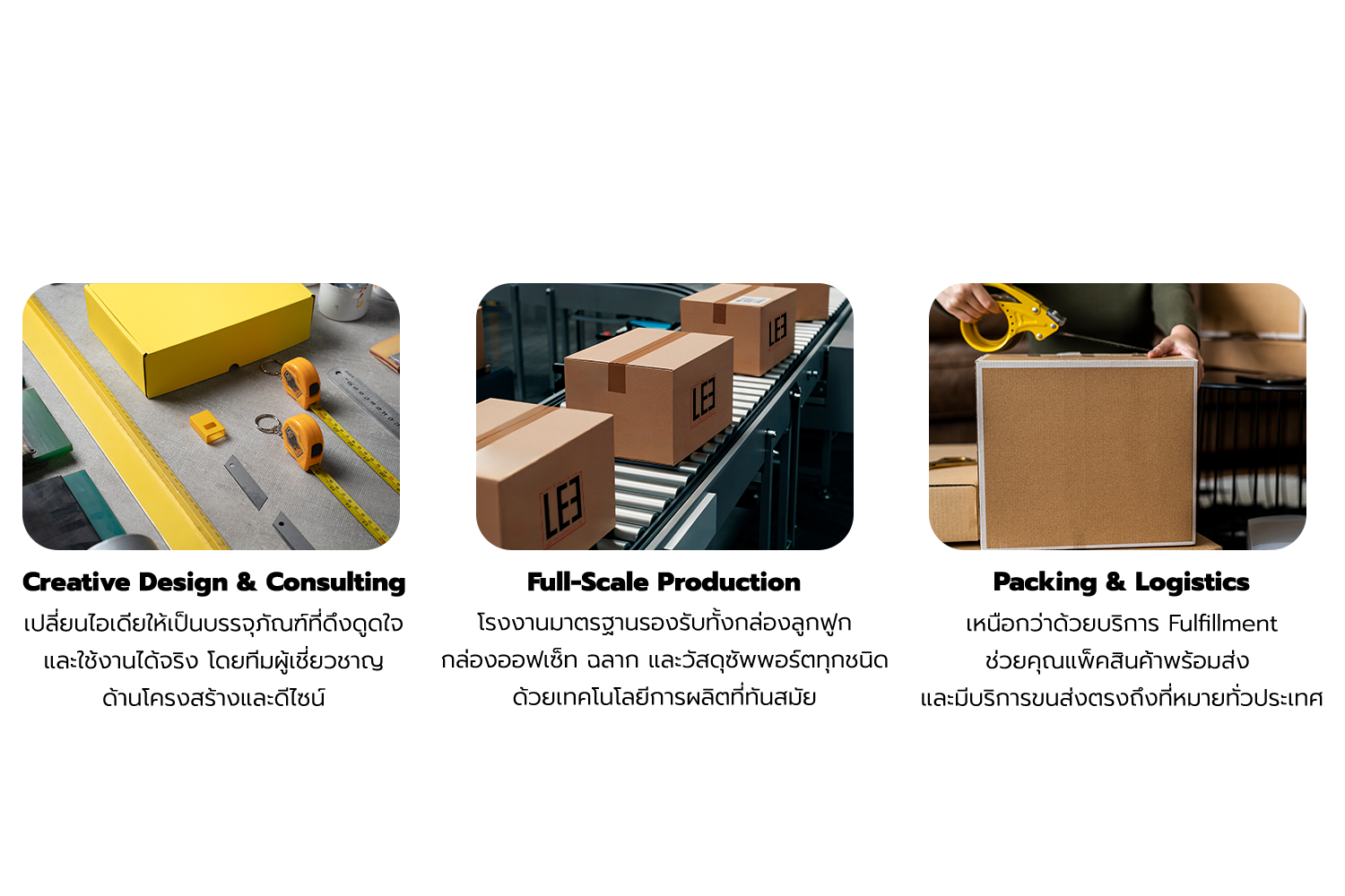 “คิดสร้างสรรค์ จบทุกความต้องการแพ็คเกจจิ้ง” Infinite Ideas, One Complete Solution. เราคือคู่คิดด้านบรรจุภัณฑ์ครบวงจร ตั้งแต่ให้คำปรึกษา ออกแบบ สั่งผลิต ไปจนถึงบริการแพ็คและจัดส่งถึงที่ ให้คุณโฟกัสกับการขาย ส่วนเรื่องหลังบ้านให้เราดูแลเพื่อให้ลูกค้ามีบรรจุภัณฑ์ที่สวยงาม แข็งแรง และประหยัดต้นทุนมากที่สุด ชลบุรี ฉะเชิงเทรา สมุทรปราการ